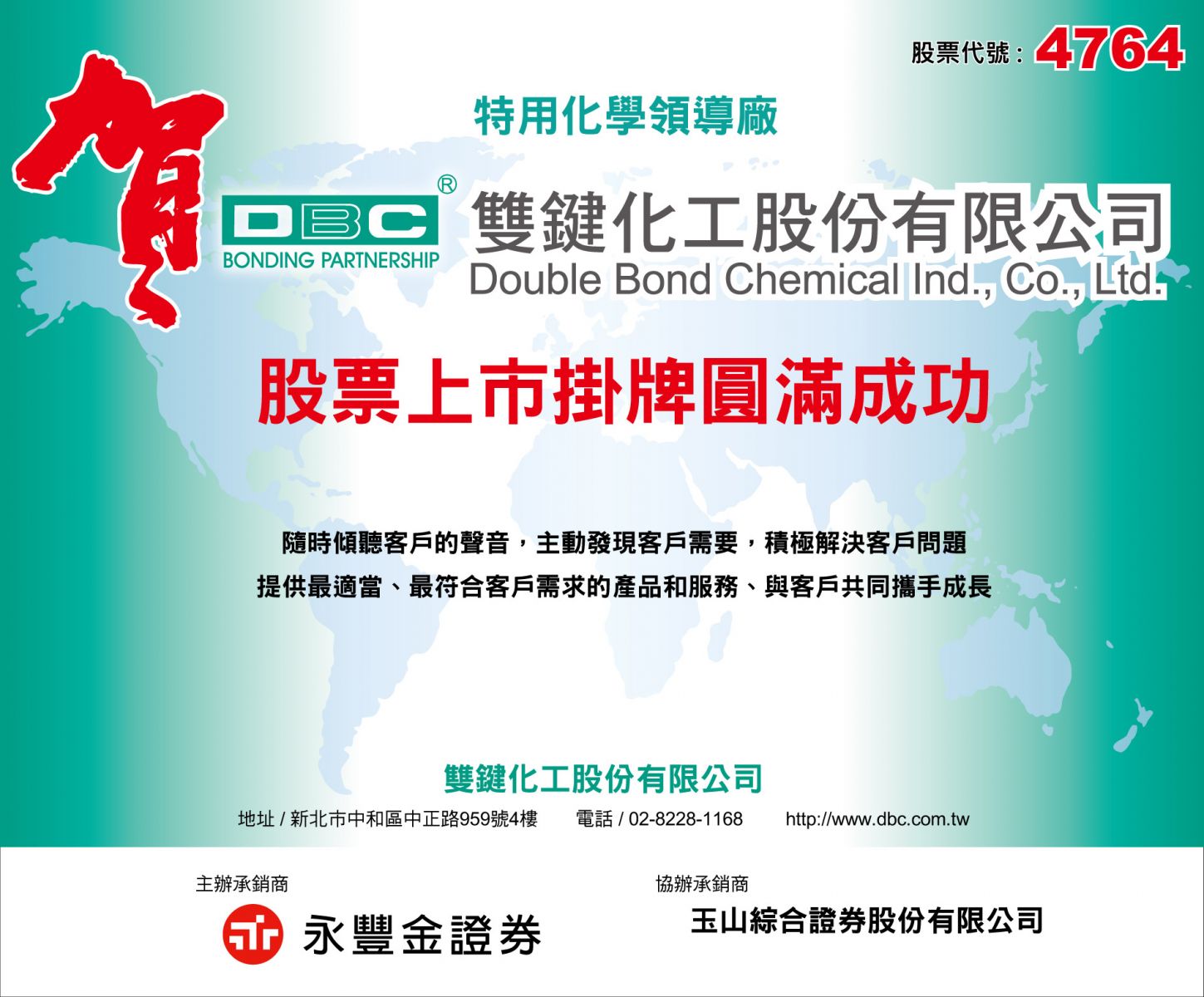 雙鍵化工(股票代號:4764)2018年1月4日股票上市掛牌圓滿成功。